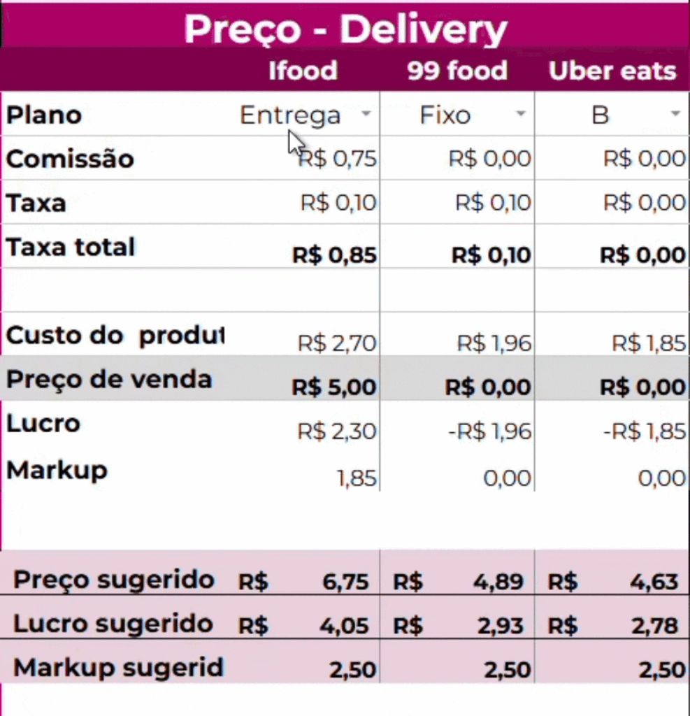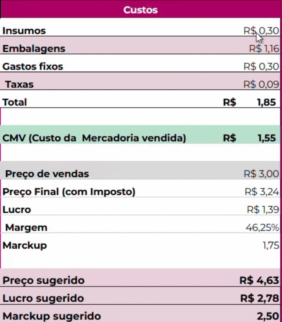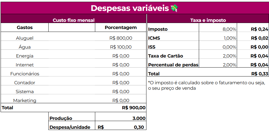 Adicione taxa de cartão, imposto, ICMS e também as despesas fixas do mês